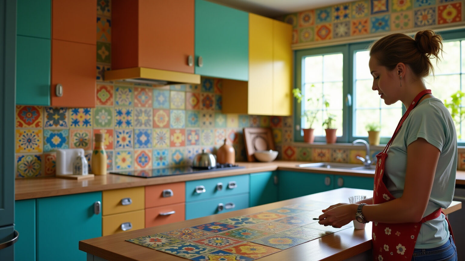 Use adesivos com estampas de ladrilhos hidráulicos ou pastilhas vintage para criar uma cozinha com um toque retrô e charmoso. Combine com móveis de madeira e eletrodomésticos coloridos para um visual ainda mais autêntico.
