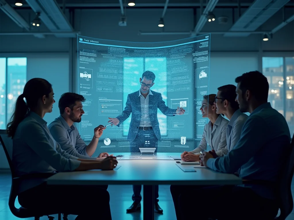 Sala de reunião com videoconferência ativa, participantes em telas divididas mostrando diversidade e colaboração em tecnologia unificada para experiência do cliente.