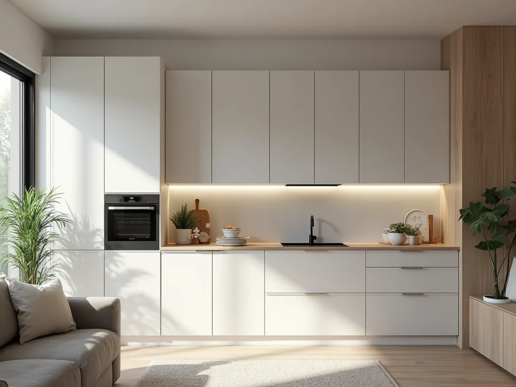 Armário de cozinha planejado com design minimalista, portas lisas em MDF branco e sistema de abertura por toque, integrando-se a uma parede com revestimento 3D.