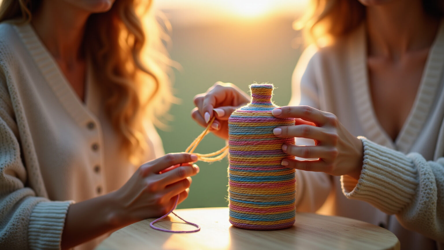 Mãos criando vaso colorido com barbante, close-up da arte terapêutica.
