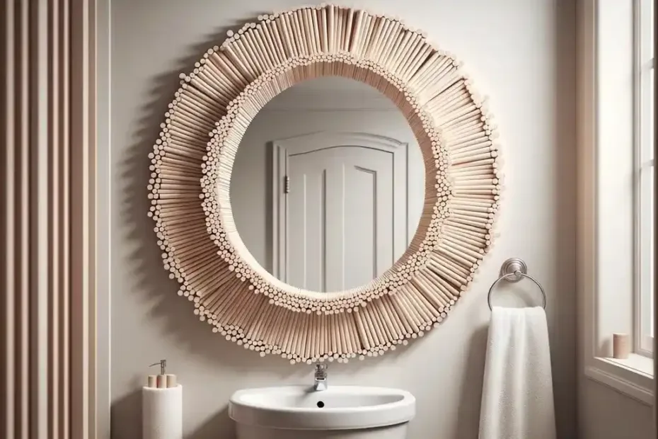 Mulher criando moldura de espelho decorativa com palitos de churrasco coloridos.
