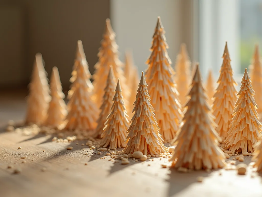 Superfície de mesa com diversos palitos de dente cortados em ângulos precisos, dispostos em um padrão de mosaico intrincado, com foco na textura da madeira clara.