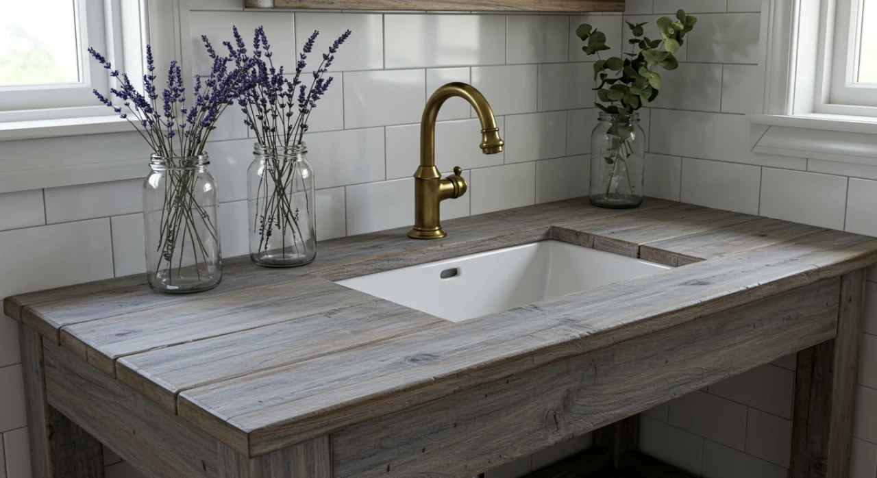- Madeira de demolição: é um material resistente e cheio de história, que traz um toque rústico e charmoso para o seu banheiro.