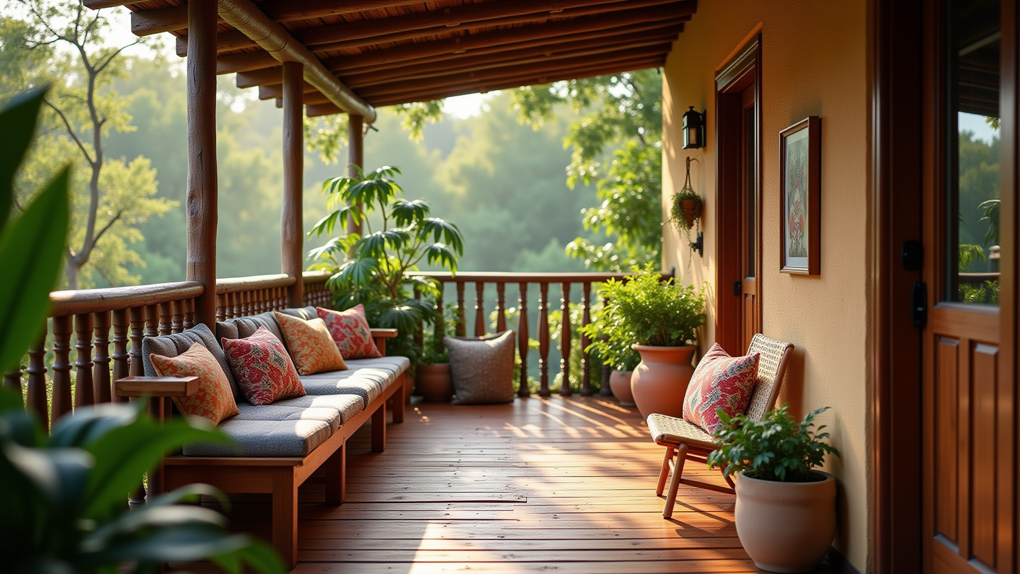 Varanda rústica: madeira, plantas e cores terrosas