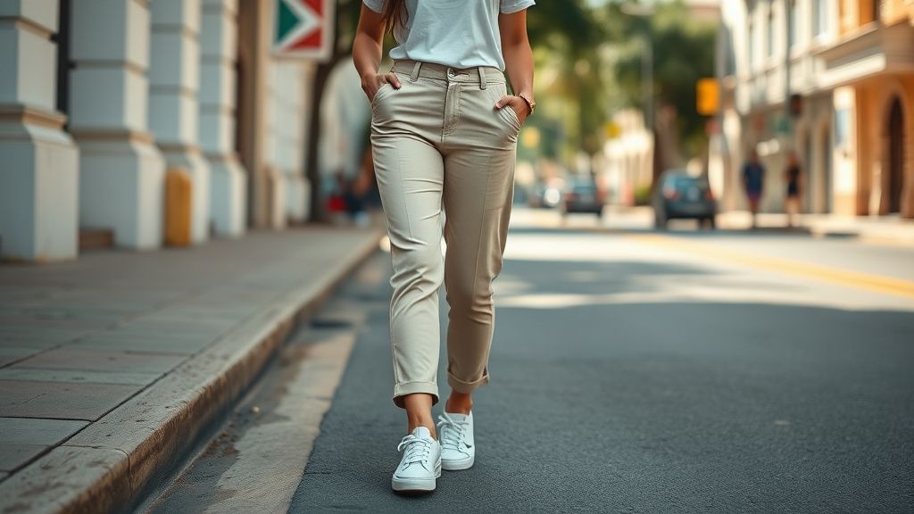 Mulher brasileira estilosa com calça de alfaiataria bege, camiseta branca e tênis branco andando em rua ensolarada do Rio.