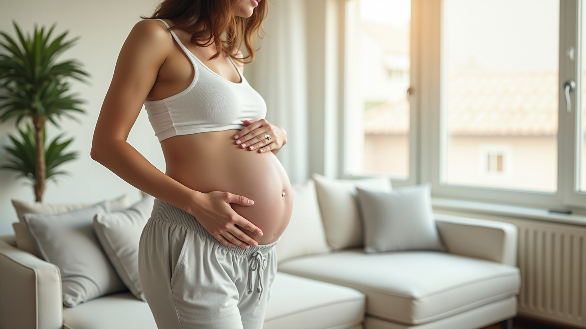 Gestante em calça de maternidade confortável com faixa de suporte na barriga.