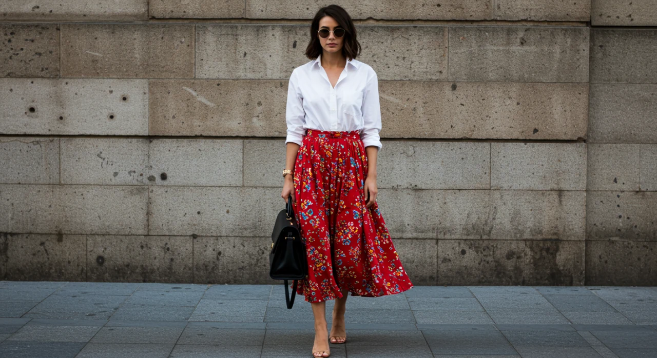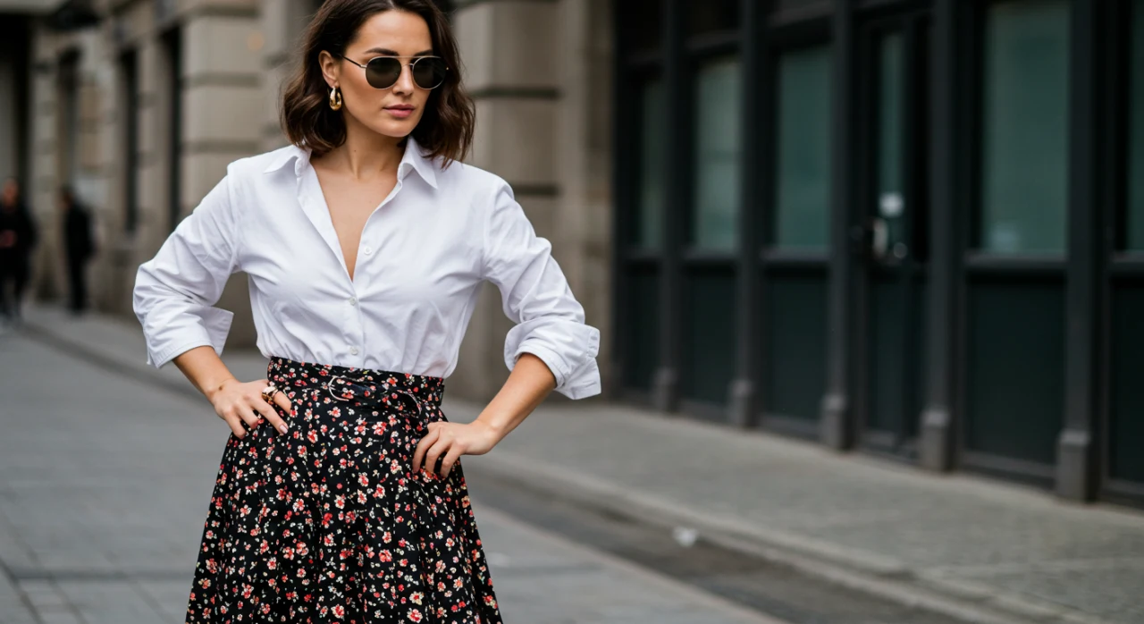 Mulher usando camisa branca com saia floral e sapatilhas, estilo romântico.