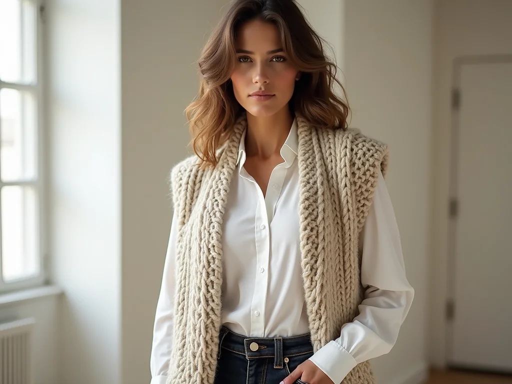 O colete de tricô pode variar muito. Tem os mais justinhos, que marcam a cintura, e os mais soltinhos, que dão um ar mais despojado. A camisa branca, por sua vez, é a base neutra que ilumina o visual. A mágica acontece na sobreposição: o colete adiciona textura e interesse, transformando a camisa básica em algo totalmente novo. Pense em diferentes tipos de tricô: liso, canelado, com tranças… cada um dá um toque único.