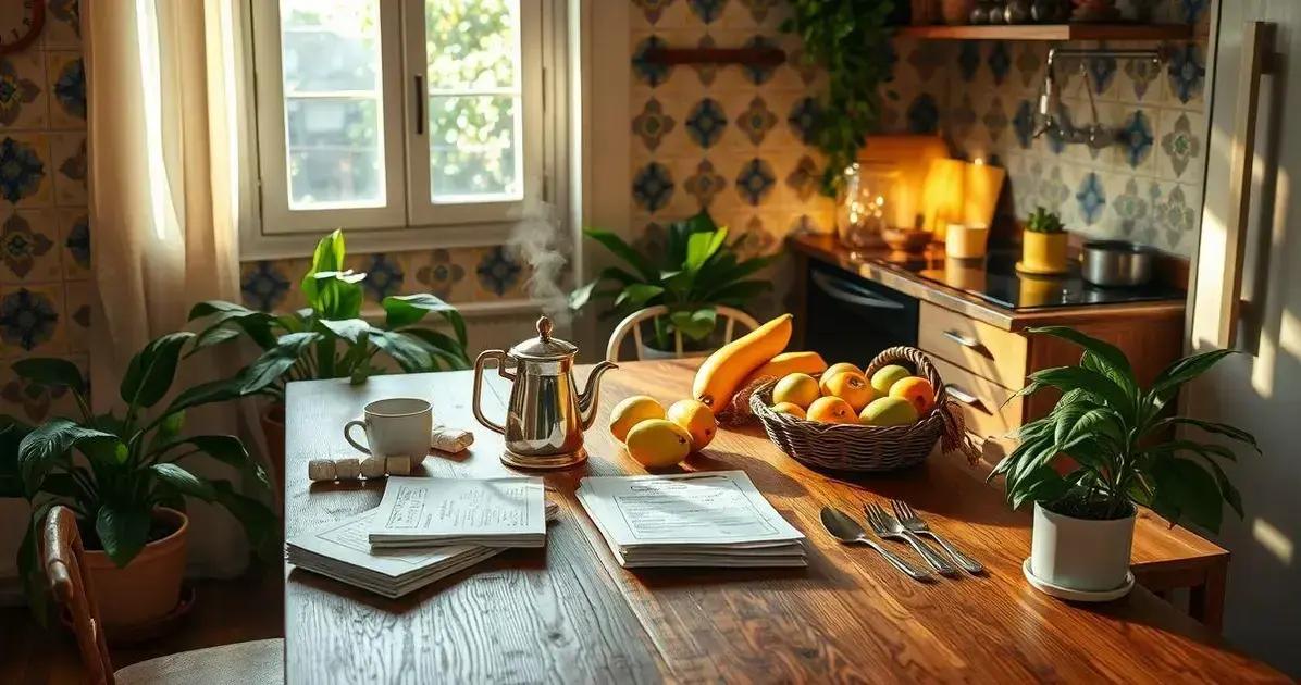 Cozinha moderna com elementos brasileiros, mostrando materiais econômicos.