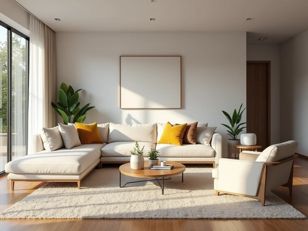 Tapete felpudo em cor creme servindo como base para um conjunto de sofá e poltronas em tons neutros, criando uma área de estar aconchegante.