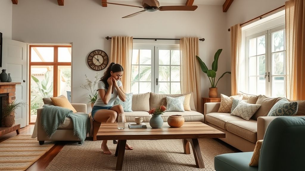 Sala de estar aconchegante com mesa de centro grande demais atrapalhando a circulação e uma mulher tropeçando.