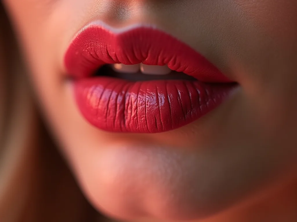 Close-up de lábios com batom cremoso na cor coral vibrante, refletindo luz suave, com foco na textura hidratante.