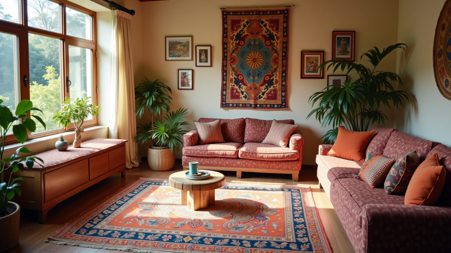 Sala aconchegante com tapete floral, luz natural e artesanato brasileiro.