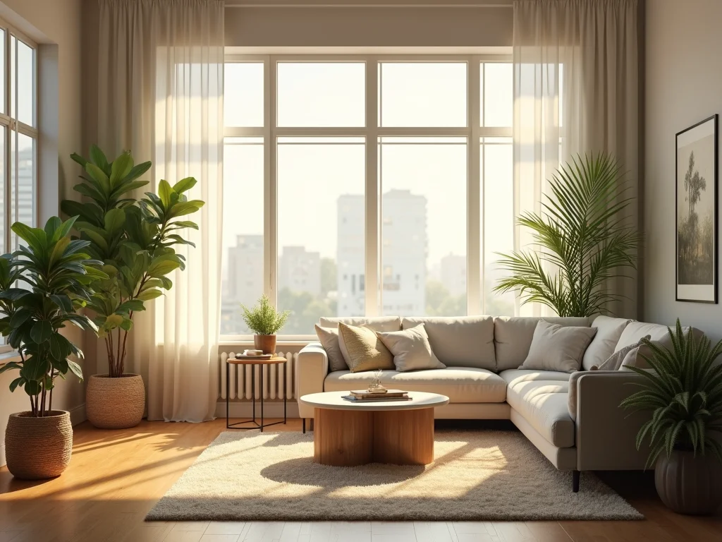 Ambiente interno com cortina de linho clara, posicionada para bloquear o sol da tarde, otimizando a redução de temperatura interna.