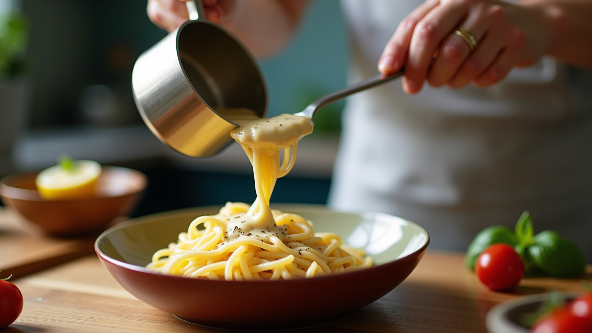 Preparo de molho branco cremoso em cozinha rústica.
