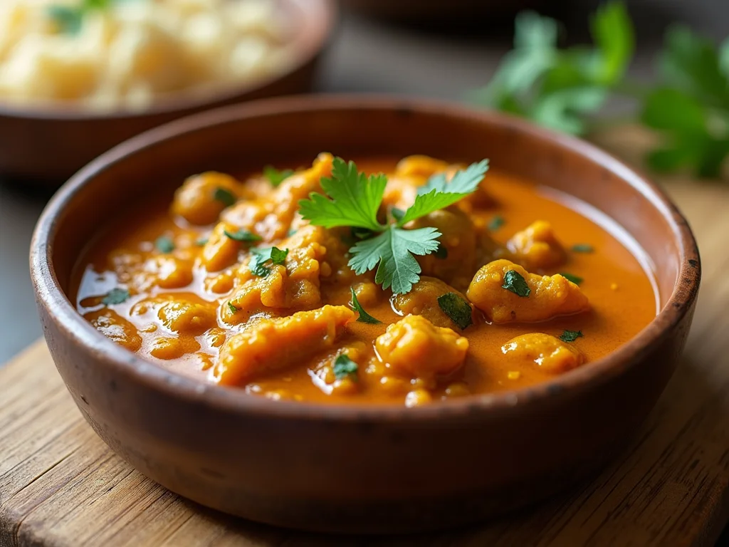 Tigela de cerâmica branca com curry de frango cremoso, adornada com folhas de coentro verde fresco e um fio de óleo, sobre superfície de madeira clara.