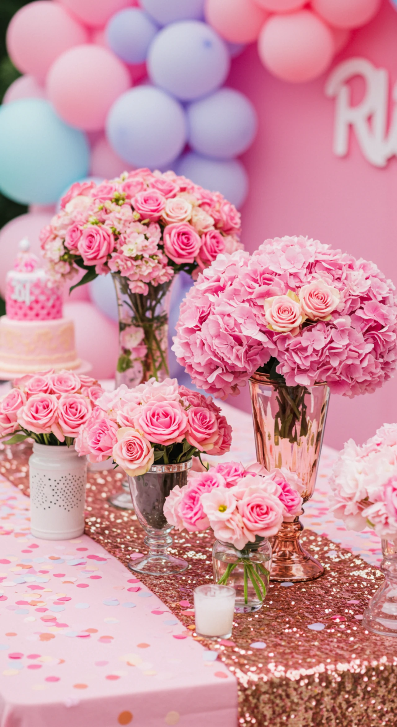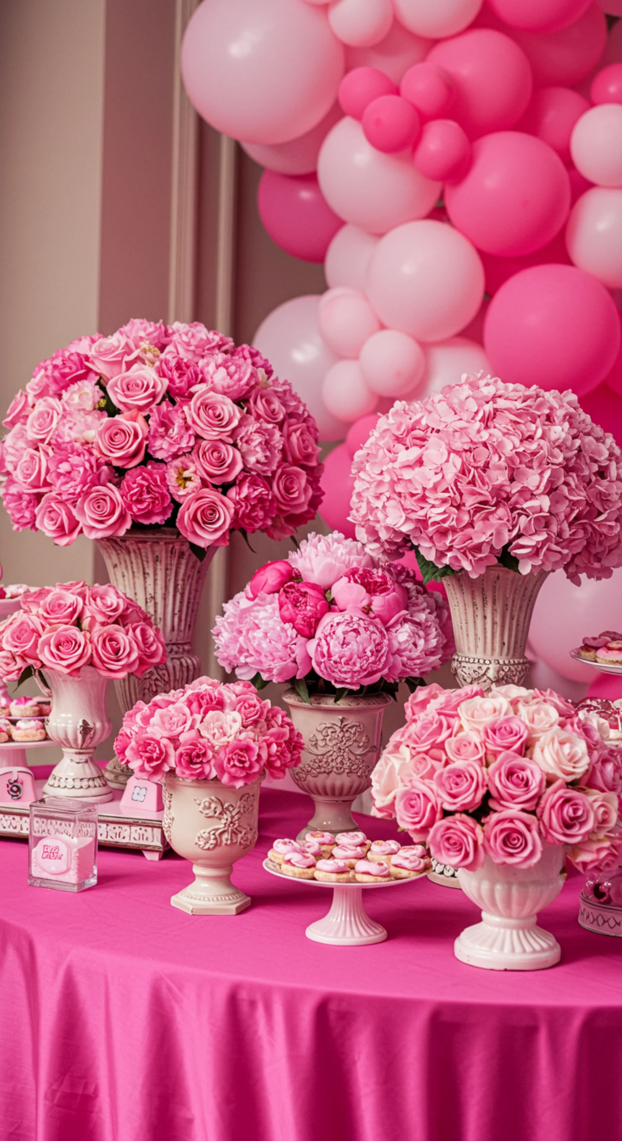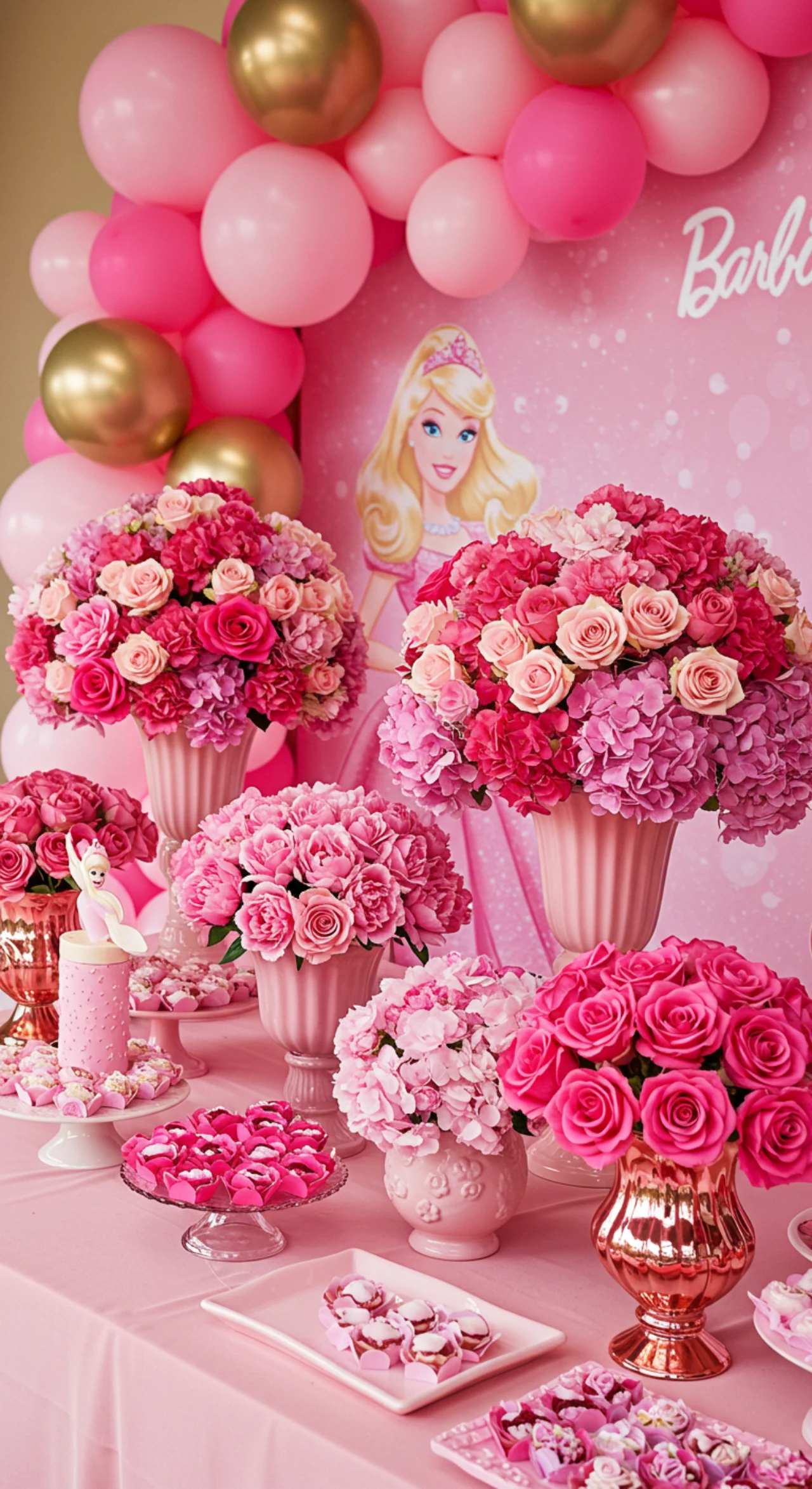 Flores trazem vida e alegria para qualquer ambiente. Use arranjos florais em tons de rosa para decorar a festa da Barbie, combinando diferentes tipos de flores, como rosas, lírios, margaridas e cravos. Coloque os arranjos em vasos de vidro ou cachepots de cerâmica e espalhe-os pela mesa, pelo painel de balões e pelo cantinho de fotos. Uma dica: use flores artificiais para economizar e garantir que a decoração dure mais tempo.