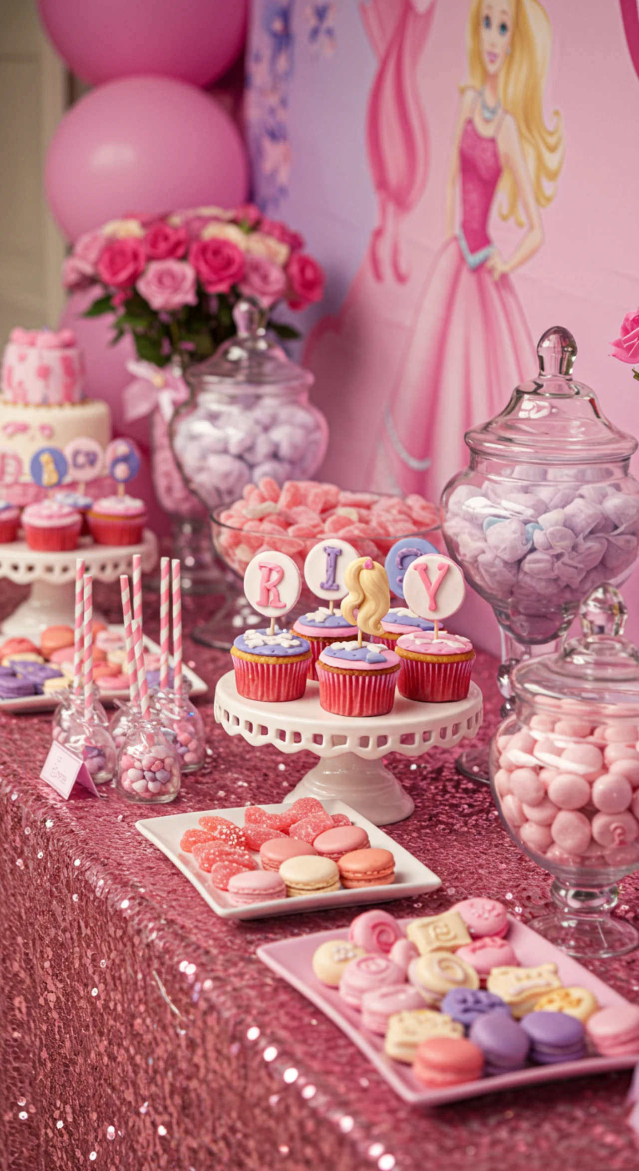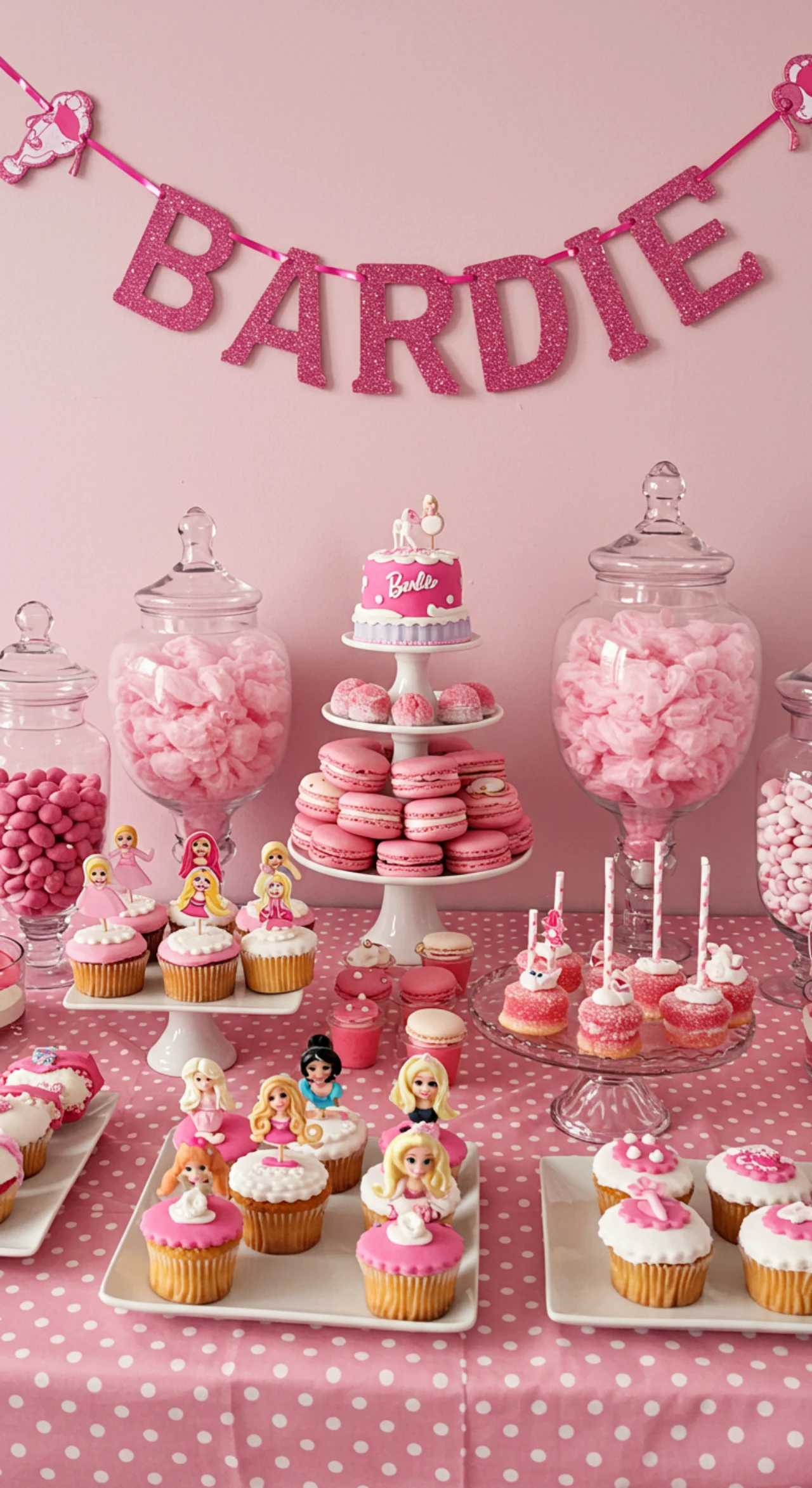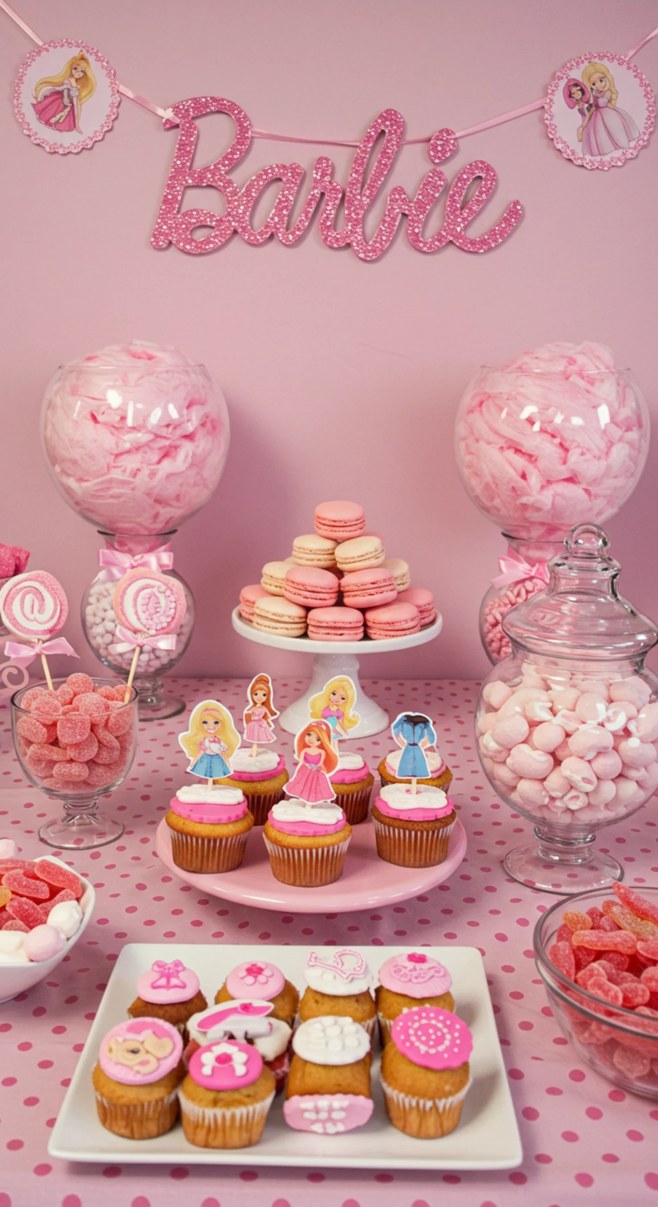 A mesa de doces é o paraíso dos convidados! Invista em doces personalizados com o tema da Barbie, como cupcakes decorados com pasta americana, pirulitos em formato de coração e brigadeiros com confeitos rosa. Não se esqueça de colocar plaquinhas com os nomes dos doces e use suportes de diferentes alturas para criar um visual dinâmico e atraente. Uma dica: alugue ou compre bandejas espelhadas para dar um toque glamuroso!