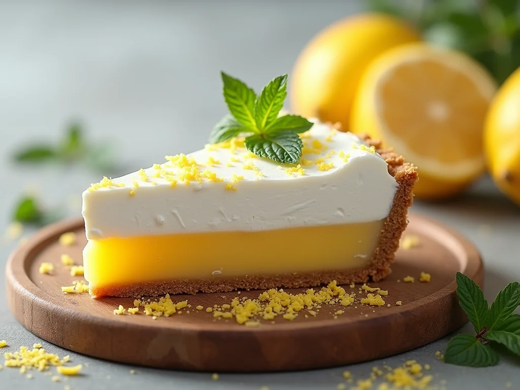 Visão lateral de uma fatia de torta de limão, exibindo as camadas distintas: massa crocante, recheio cremoso e cobertura de merengue.