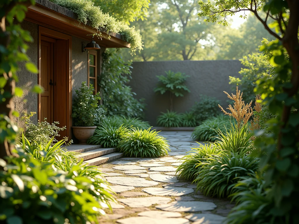 Adicione os sinos de vento ou uma pequena fonte de água. Espalhe pedras de diferentes texturas e troncos pelo caminho. Cada detalhe contribui para a imersão sensorial.