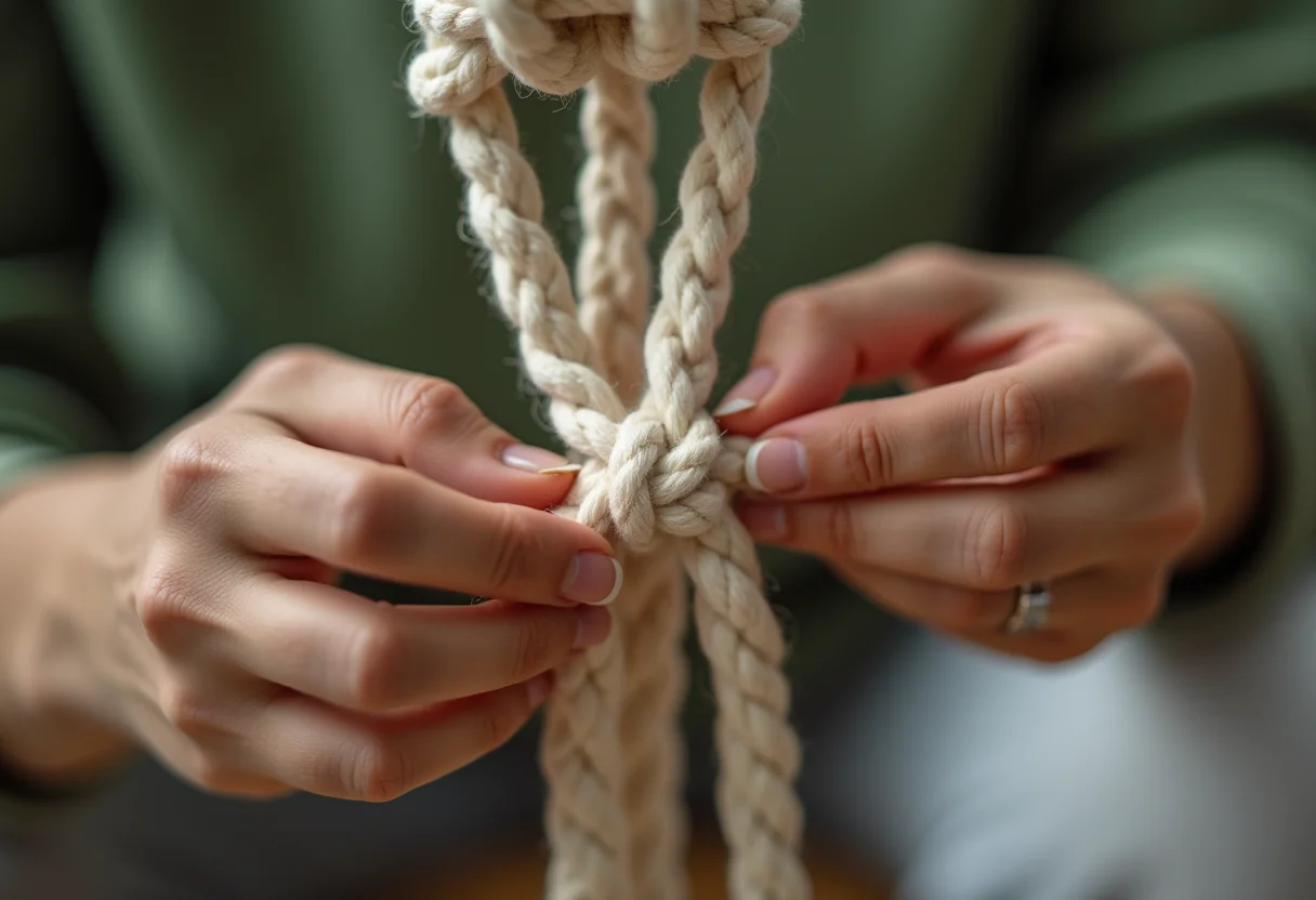 - Faça os nós: Em cada grupo de 4 barbantes, faça nós simples (nó quadrado) a cerca de 5 cm da argola. Repita esse processo até atingir o comprimento desejado para o seu vaso.