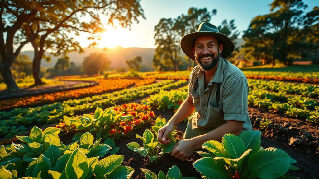 Fazenda biodinâmica no Brasil com diversas culturas e solo saudável.