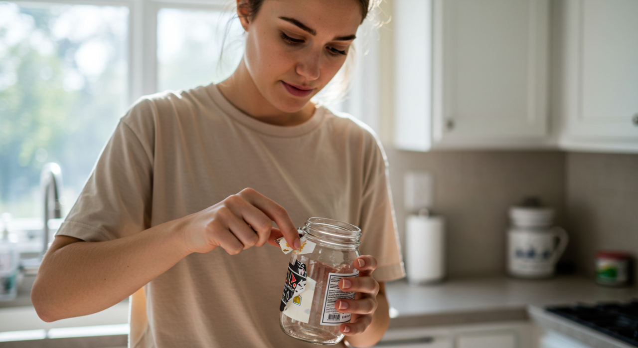 Óleo vegetal ou água quente com sabão costumam ser eficazes para remover cola de rótulo de vidro. Deixe agir por alguns minutos antes de esfregar.