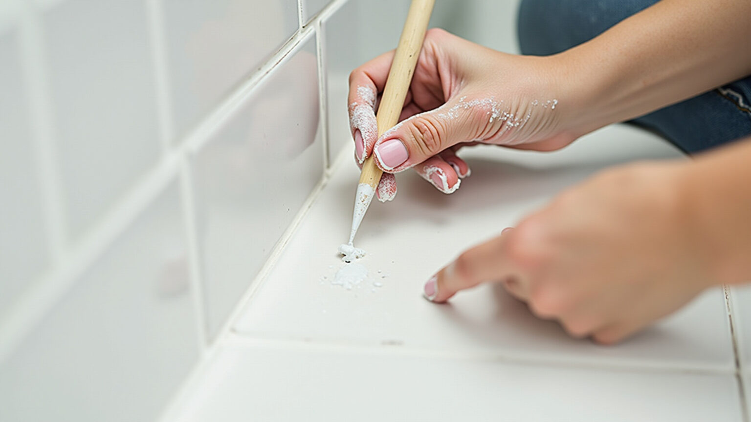 Mãos femininas aplicando rejunte em azulejos de banheiro, close-up.