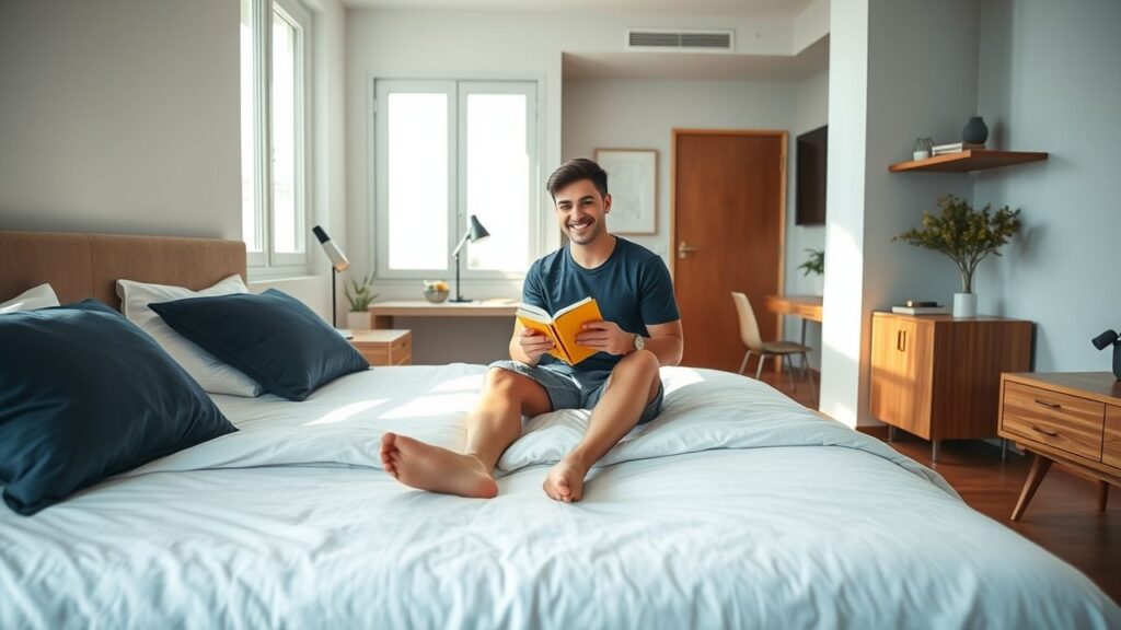 Para um quarto masculino que inspire calma e relaxamento, combine uma paleta de cores neutras com diversas texturas naturais. Essa combinação cria um ambiente sensorialmente rico e convidativo, perfeito para descansar e recarregar as energias.