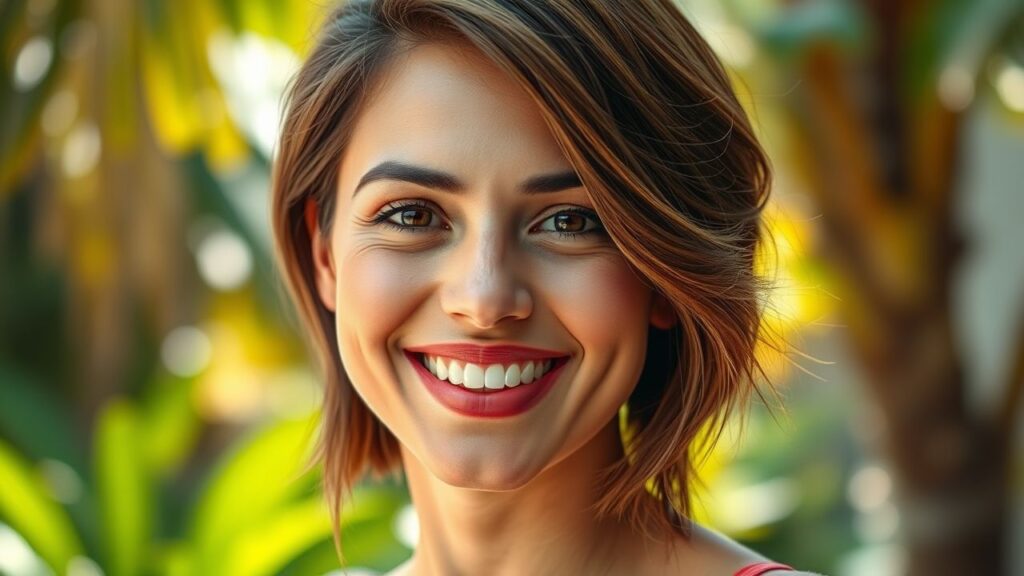 Mulher brasileira sorrindo com rosto redondo, beleza natural.