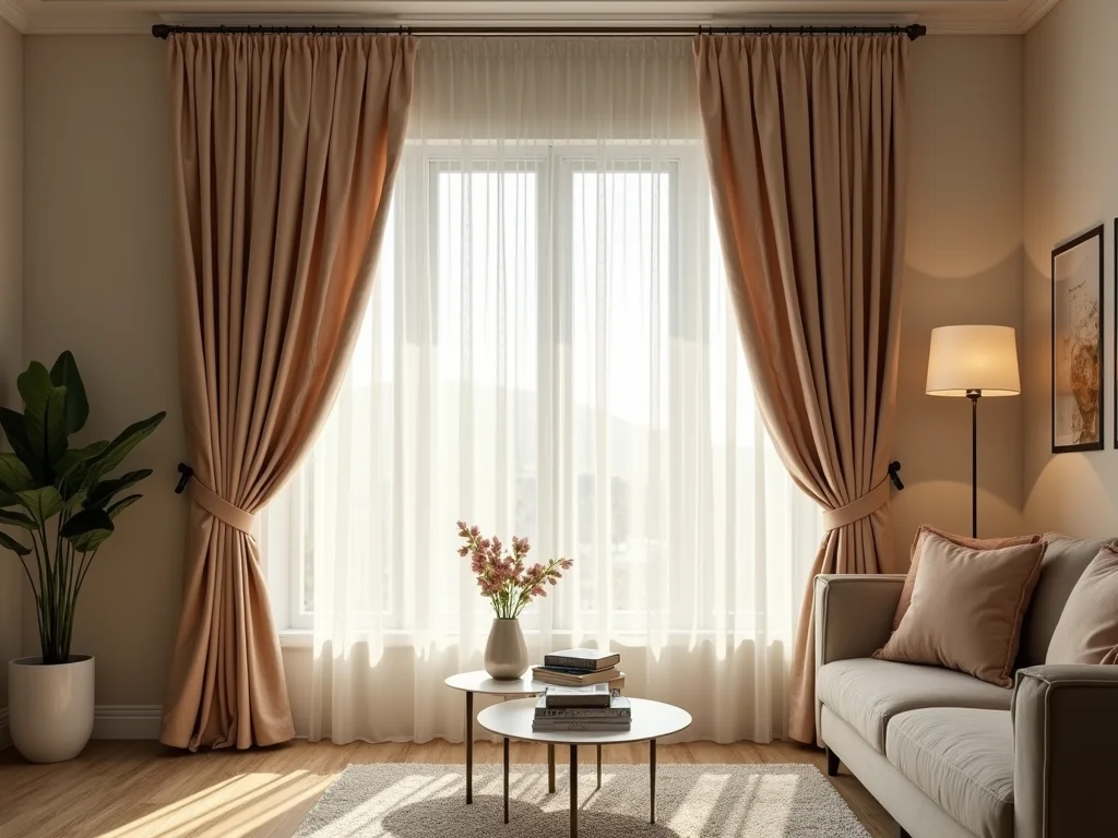Sala de estar com cortinas de voil duplo, uma camada branca e outra em tom pastel, criando um efeito de profundidade e suavidade.