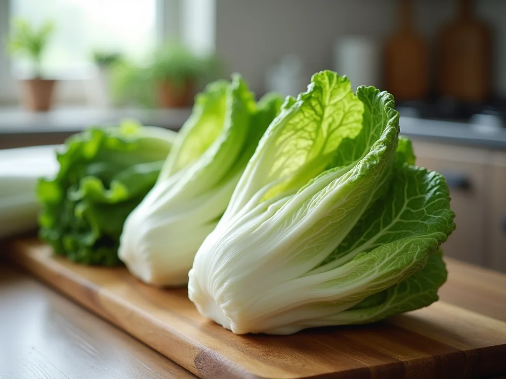 Um maço de couve chinesa fresca com talos brancos e firmes, apresentando um leve brilho na superfície das folhas.