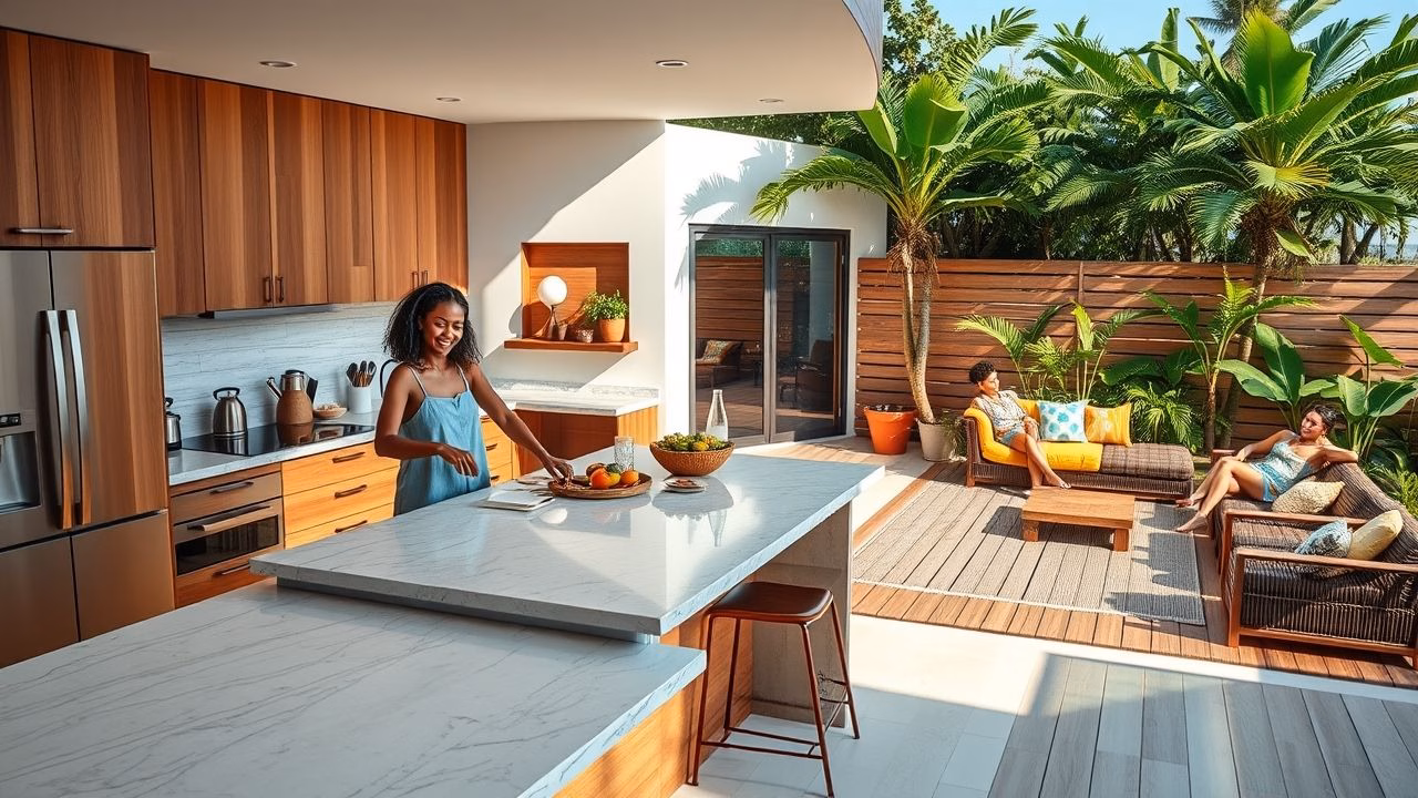 Cozinha moderna com ilha integrada ao lounge externo, decoração vibrante e estilo brasileiro.