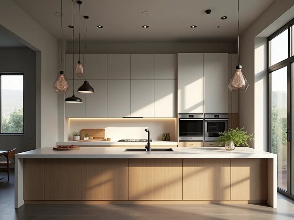 O layout da sua cozinha dita o fluxo e a funcionalidade. Para cozinhas amplas, a cozinha com ilha é um sonho. Ela não só amplia o espaço de trabalho e de refeições, mas também se torna um ponto focal incrível. O segredo é garantir pelo menos 90 cm de circulação ao redor para um uso confortável. Pense em bancadas de quartzo branco ou Dekton preto para um contraste dramático.