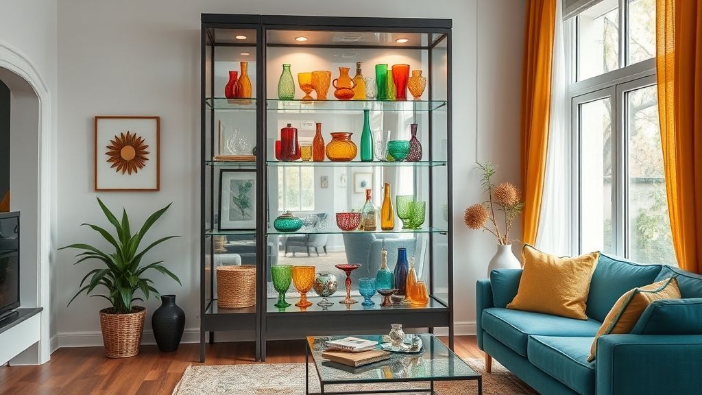 Cristaleira moderna em sala vibrante, com louças coloridas e iluminação natural.