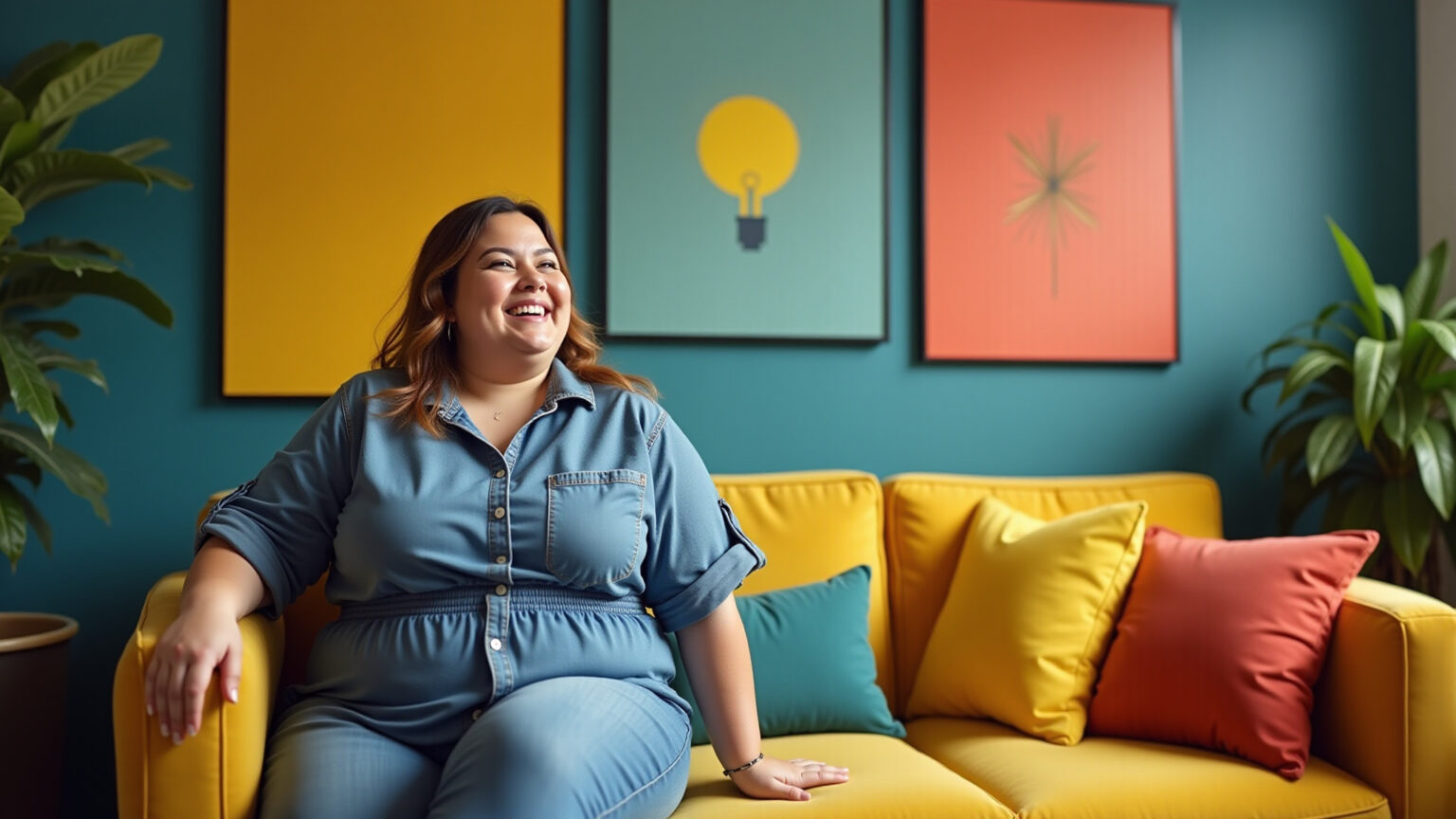 Mulher brasileira plus size sorrindo em uma sala de estar colorida e bem decorada.