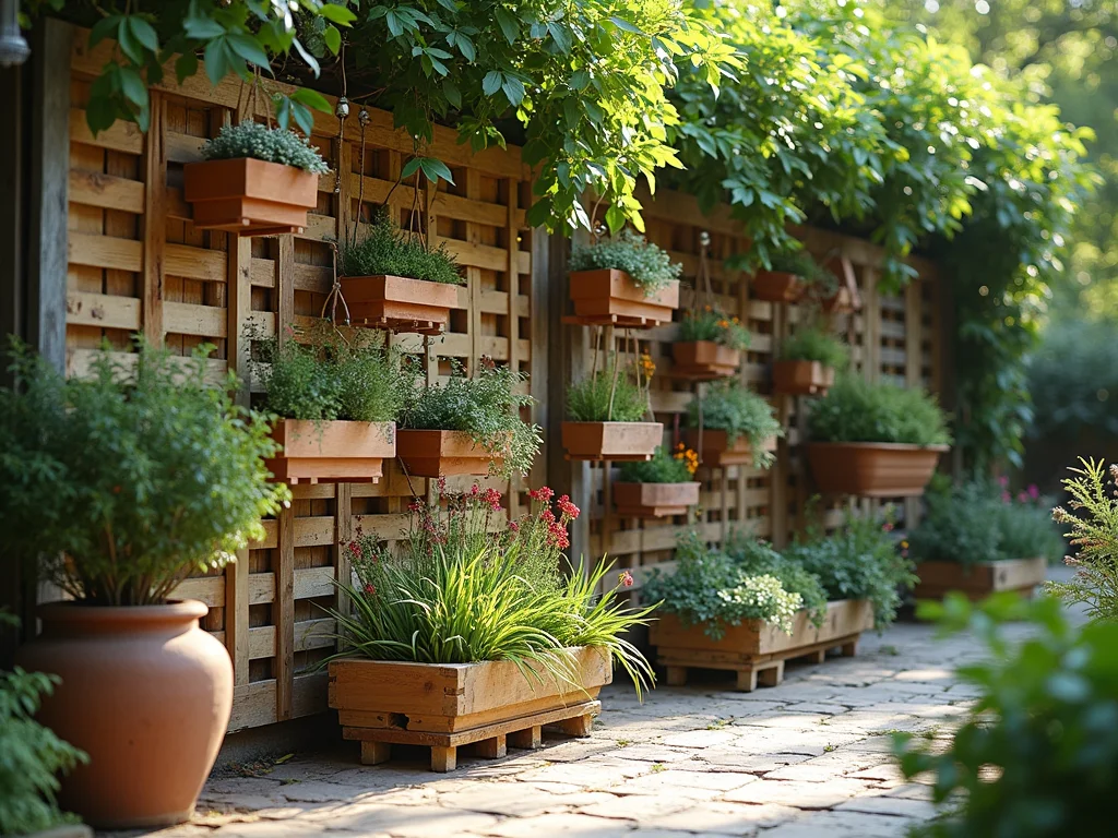 Horta vertical compacta montada em um único pallet, com pequenos vasos de temperos e ervas dispostos em fileiras, ideal para espaços pequenos.