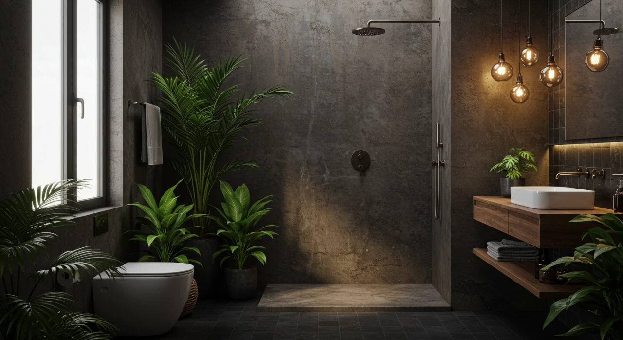 11. Plantas no Banheiro com Cimento Queimado: Natureza e Frescor