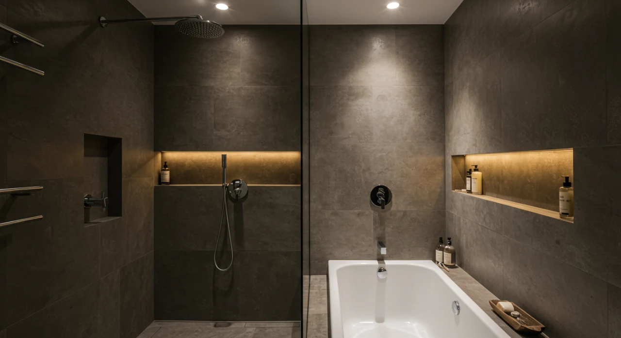 Nichos embutidos na parede com acabamento em cimento queimado são uma ótima maneira de otimizar o espaço e organizar seus produtos de higiene pessoal. Além de funcionais, eles adicionam um toque de charme ao banheiro. Vamos combinar, organização é tudo, né?