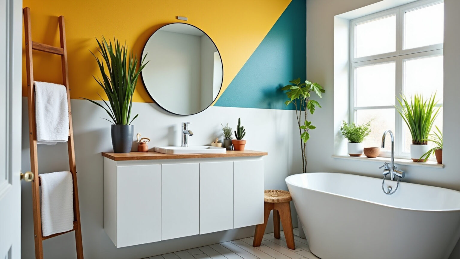 Banheiro pequeno com decoração DIY: parede pintada, escada como porta-toalhas e plantas vibrantes.