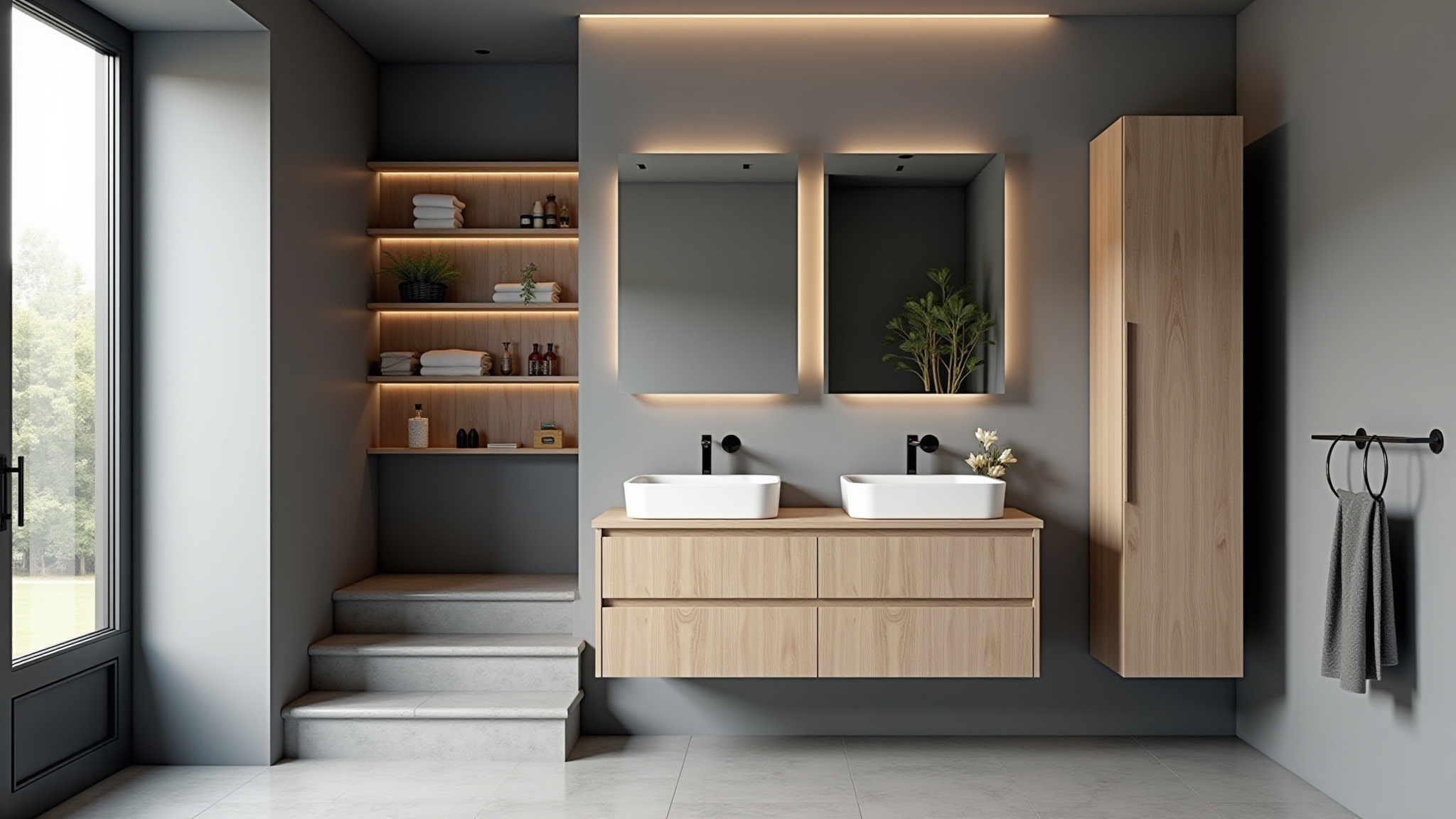 Combine iluminação geral com iluminação de tarefa, como spots de luz direcionados para o espelho. A iluminação indireta também é uma ótima opção para criar um ambiente relaxante.