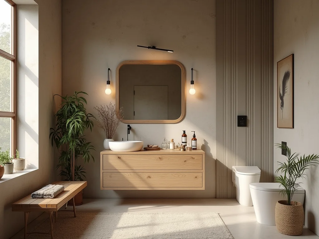 “A decoração de banheiro rústico foca na conexão com a natureza através de materiais brutos, tons terrosos e texturas marcantes que proporcionam conforto e acolhimento.”