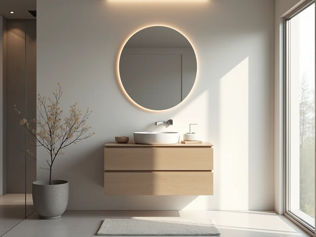 Prateleira flutuante de madeira clara sobre bancada de porcelanato branco, com espelho redondo e vaso de planta verde.