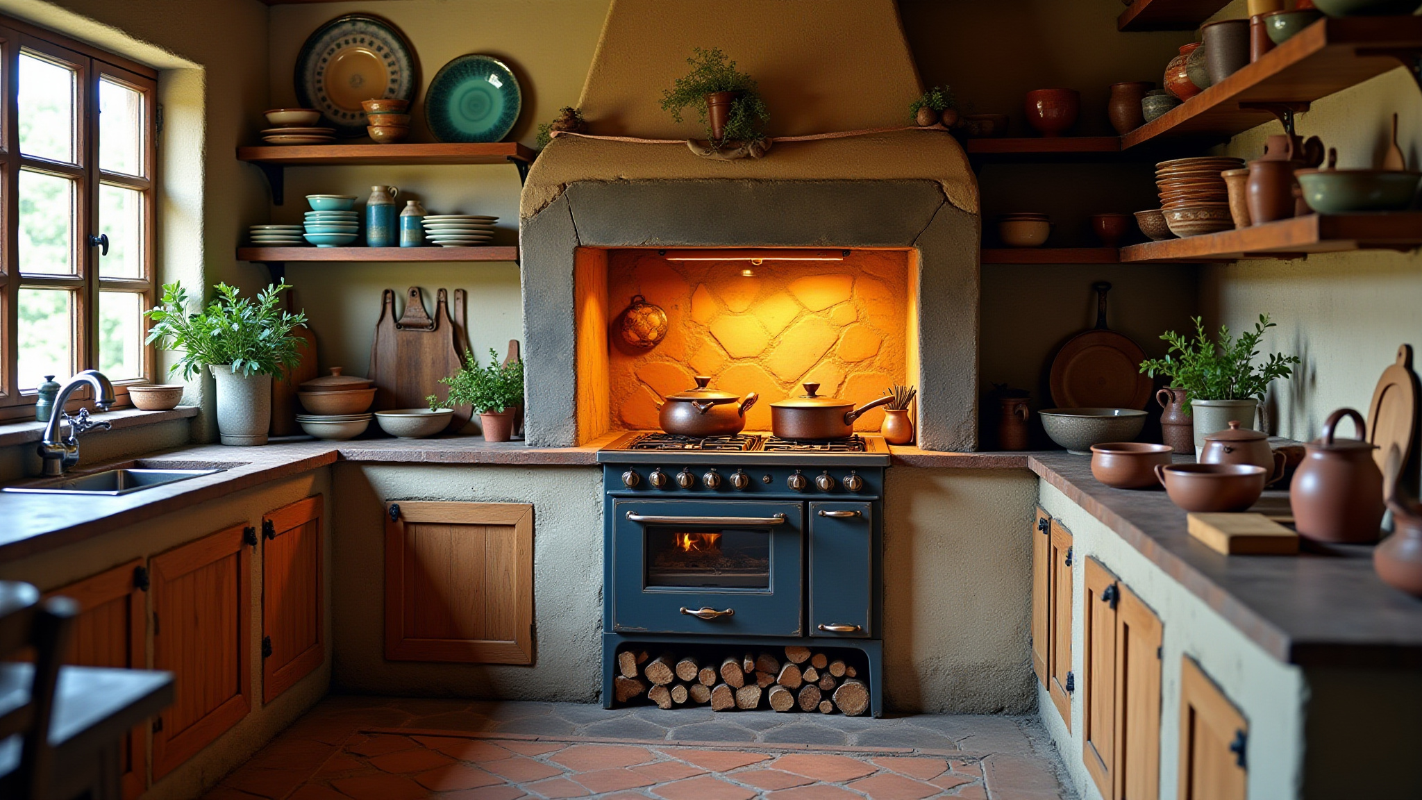 Além de funcional, o fogão à lenha é um elemento central na decoração, trazendo um ar nostálgico e convidativo à cozinha.