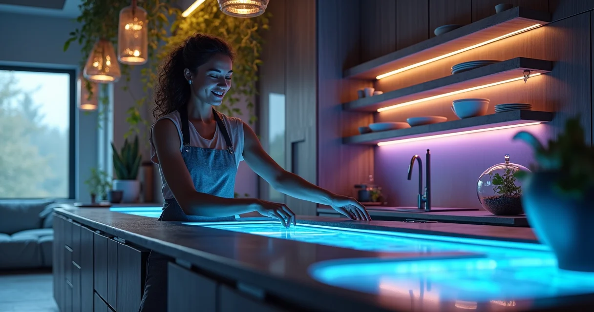 Luz suave sob o armário iluminando utensílios.