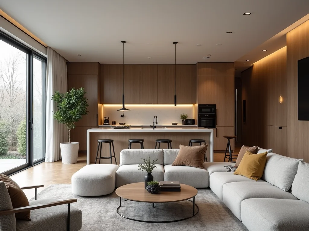 Cozinha com armários embutidos em tom amadeirado, integrada a uma sala de estar com iluminação indireta e tapete felpudo.