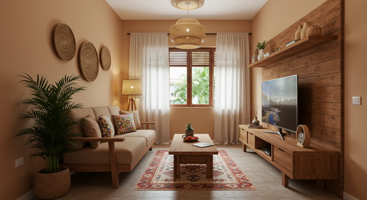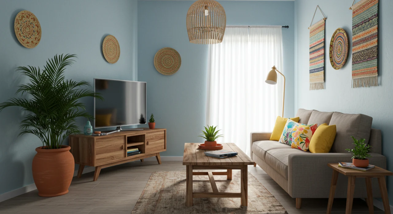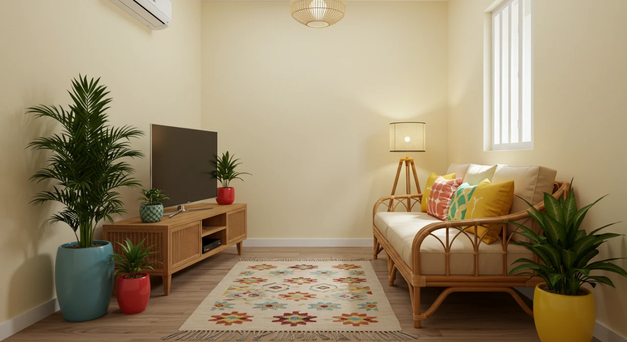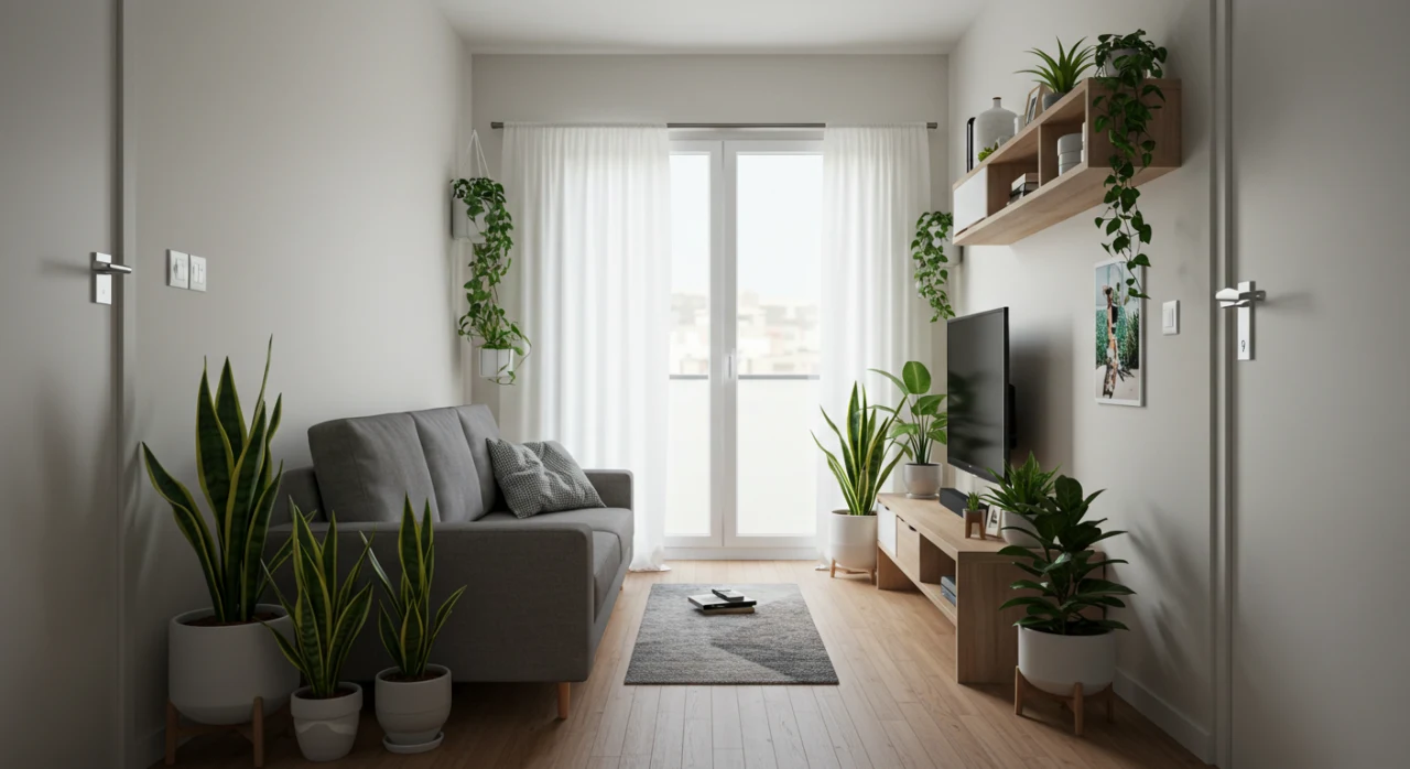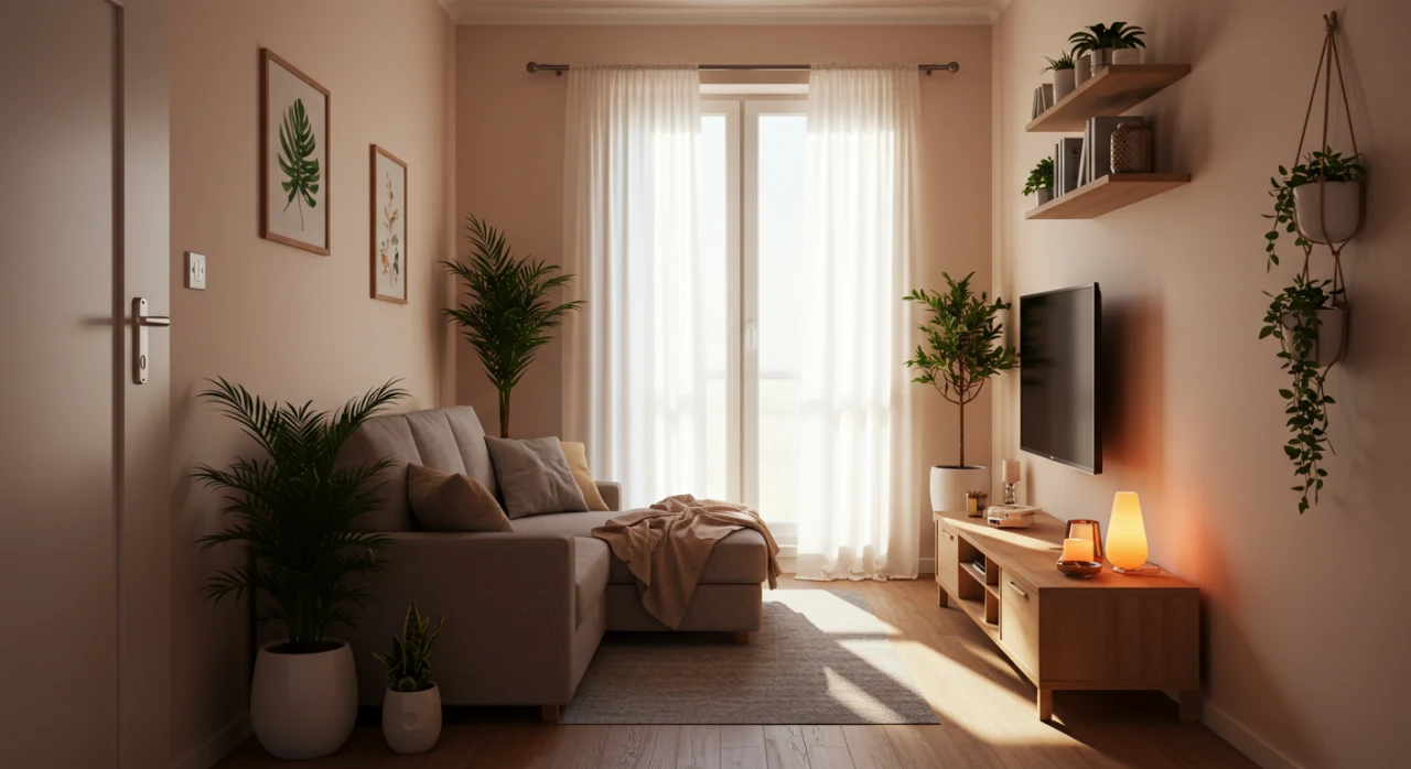 Sala pequena organizada com itens essenciais, plantas e iluminação estratégica, criando um ambiente aconchegante.