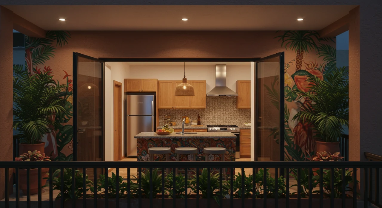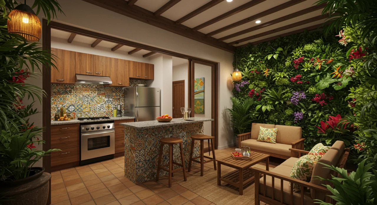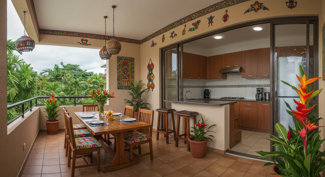 Varanda gourmet vibrante com churrasqueira, almofadas coloridas e plantas tropicais.