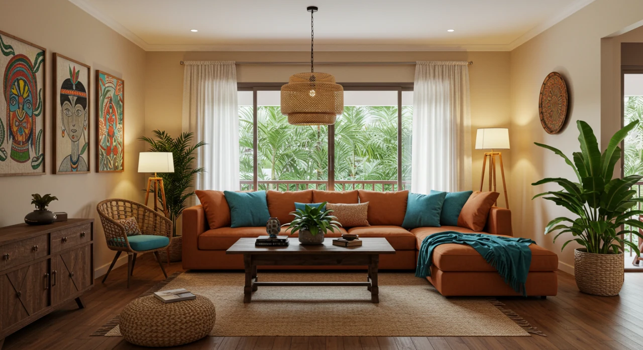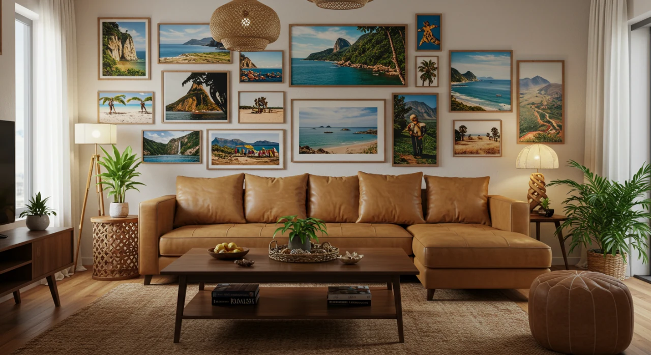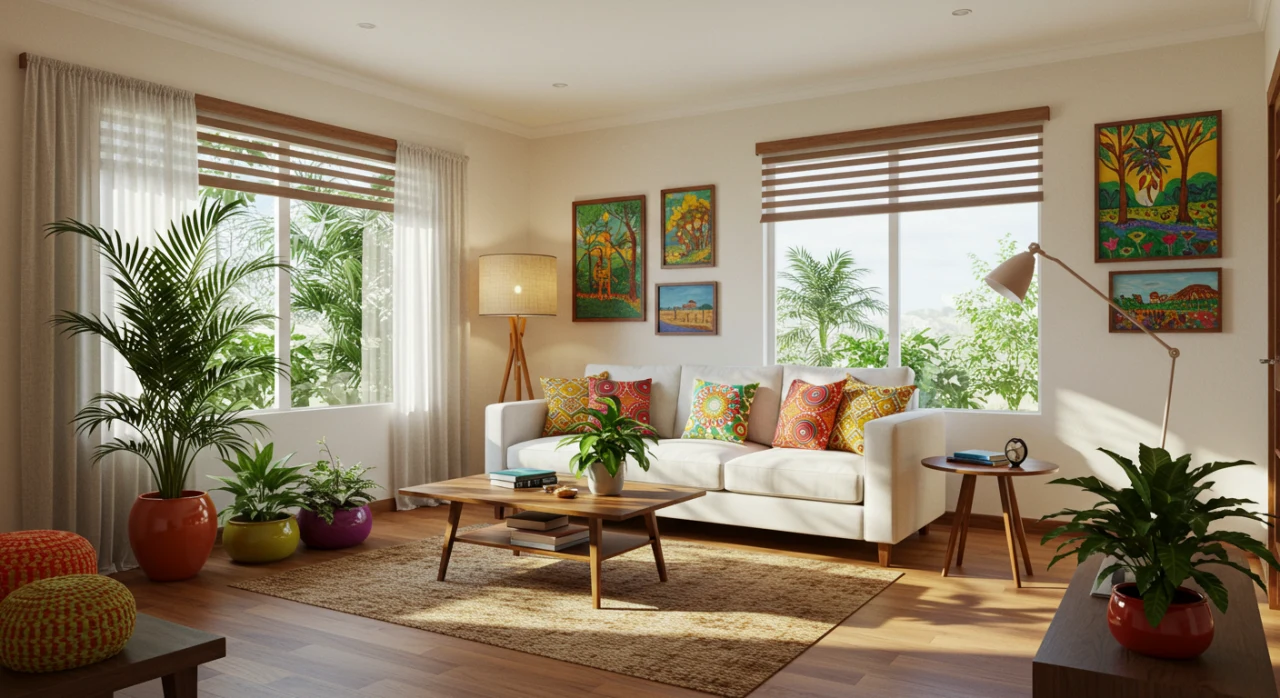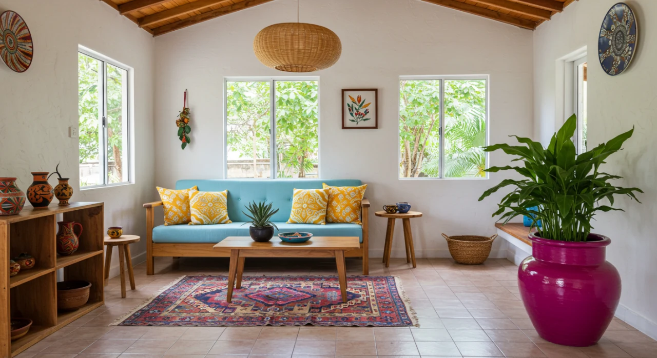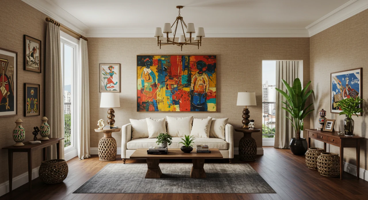 Sala de estar decorada com móveis confortáveis e elementos da cultura brasileira, mostrando pessoas diversas.
