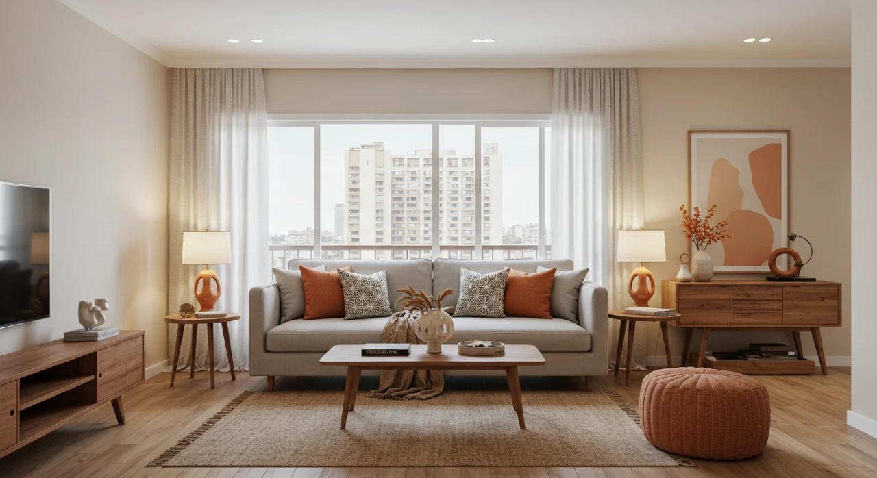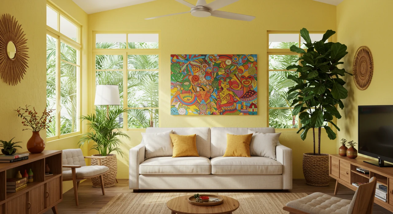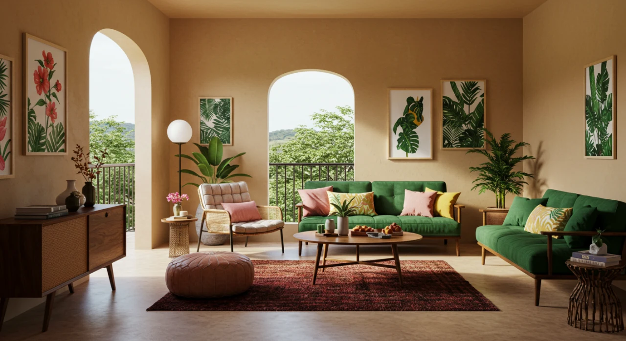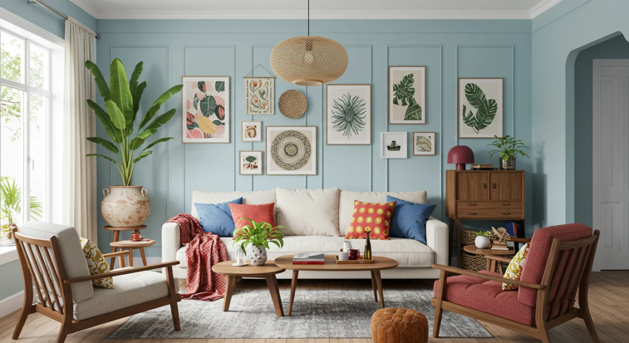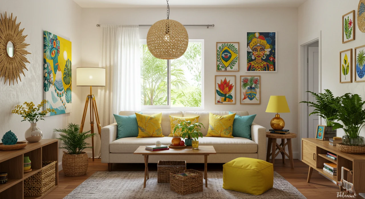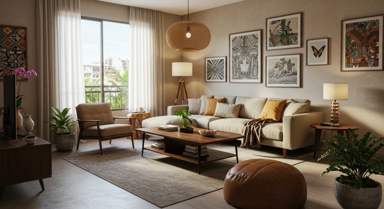 Sala de estar decorada com móveis confortáveis e elementos da cultura brasileira, mostrando pessoas diversas.